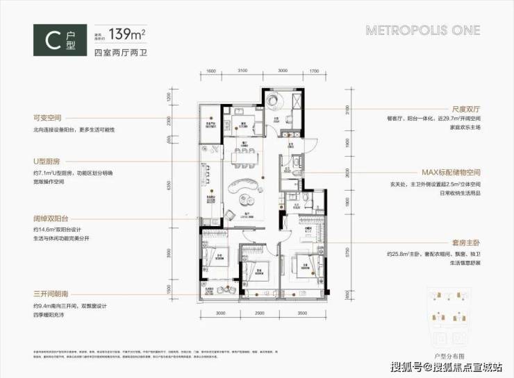 约139平方米的户型则展示了对生活品质的追求,宽敞的大厅设计让居室显得开阔,双阳台和双飘窗的设计巧妙地分隔了生活与休闲区。这样的环境使得每天的居住都成为享受。4室2厅2卫餐客厅阳台一体化,近约29.7㎡开阔空间,9.4m南向三开间,双飘窗设计约25.8㎡套房式主卧奢华衣帽间