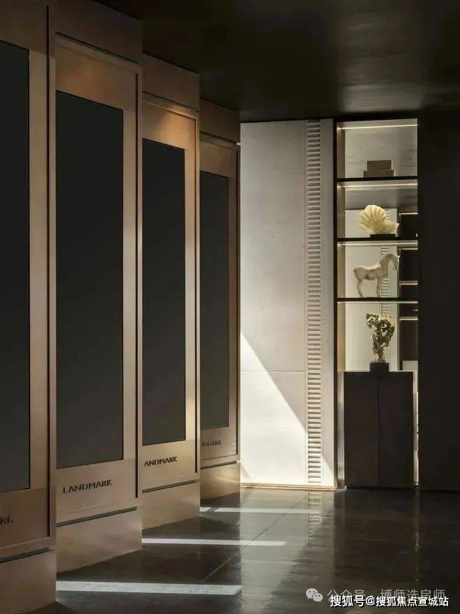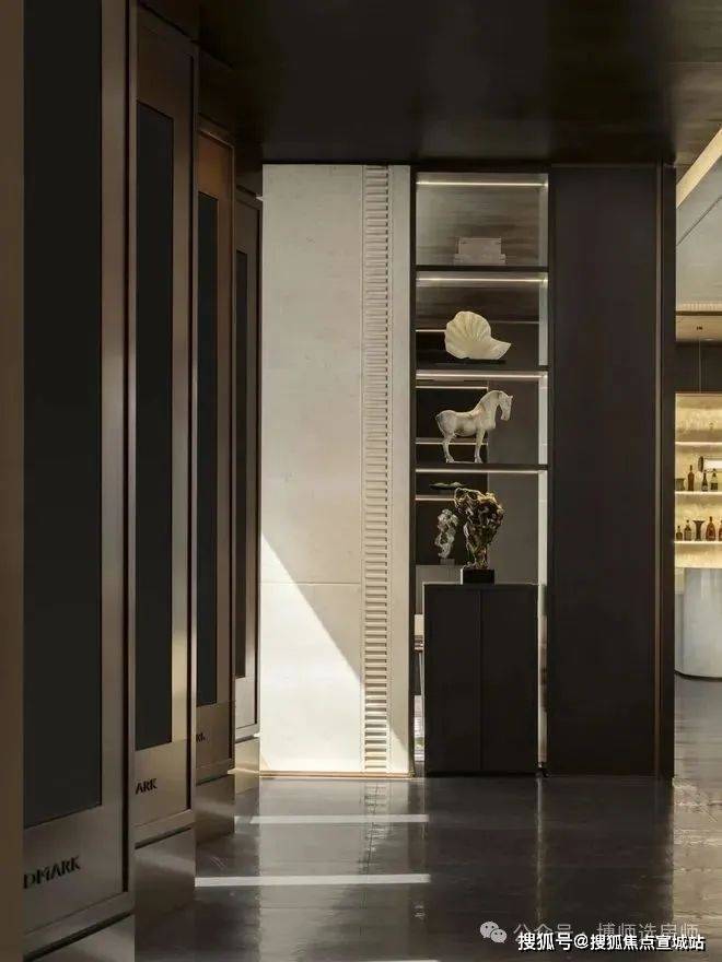 利用现代科技LED艺术装置背景,作为可变空间元素,将江南园林及苏州在地性文化融入其中,并随时变换。墙面通过深色木化作中式花窗格。大门采用厚铜门,表现出江南大宅的门厅感受,迎接客人到来。