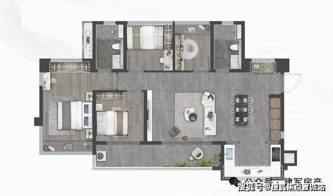 106㎡的4房2厅2卫,设计的是横厅南北通透格局,客餐厅开间5.6米,餐厨一体化,约13.7米超幕视野,超长阳台,主卧转角270°大飘窗,只有2栋07户型才有,得房率:78.99%(不含赠送),阳台主朝西南向。