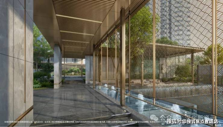 以灯带、镂空格栅顶以及御湖水纹,打造了风雨连廊,在保障无雨归家的同时,设计师通过与水借景,与光借景,与园林借景,带给业主归家的第三道礼序。