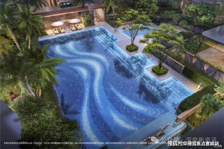 泳池入口设计了穿孔不锈钢雕塑,以三片水流捧着散落星光做出"繁星"造型,泳池池底定制繁星艺术瓷砖,拼贴成流动星河图案,同时配备水下星星灯、池壁灯,延展出无边际泳池的效果。
