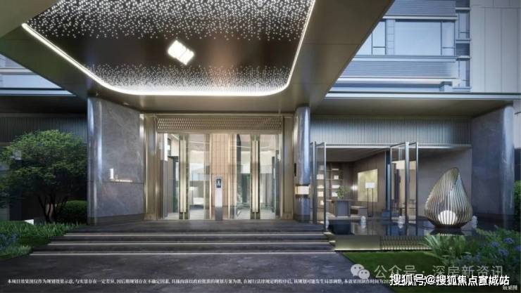 小区大门整体以“皇冠”为造型打造。搭配汉白玉雕塑、安哥拉黑大理石、罗汉松,紫山水奢石,带给业主尊贵的第一道归家礼序。