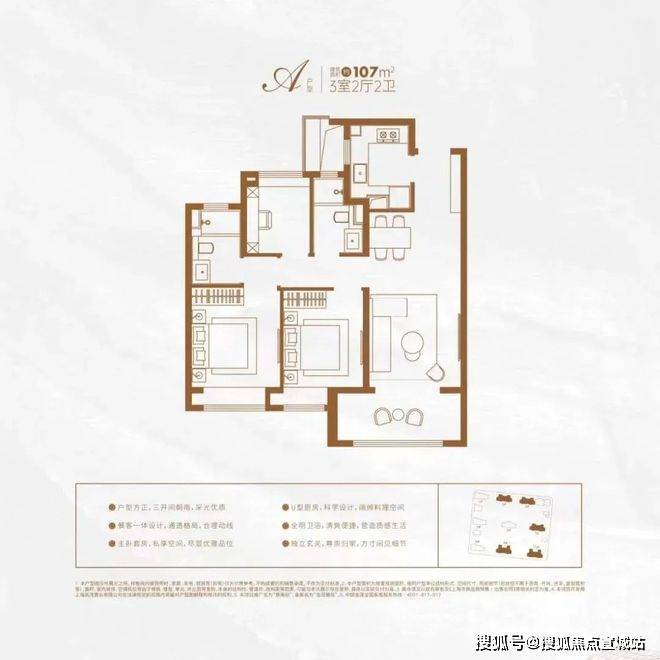 该户型集LDBK一体化、玄关入户、动静分区设计、U型厨房、双卧飘窗、强大收纳等多重优势于一体,在功能性与舒适度上几乎都做到了极致!