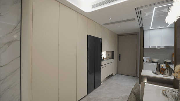 值得一提的是,入户玄关设置一整面的玄关柜空间,左侧分户墙处增设“凹型空间",预留内嵌双开门冰箱空间。