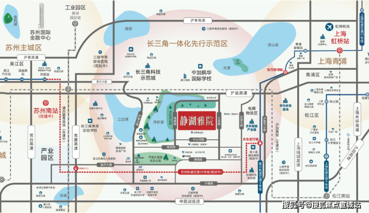 距苏州南站仅7公里,通车后15分钟到虹桥。驾车10分钟到青浦,30分钟到虹桥。驾车10分钟达到上海17号线西岑站,规划苏州地铁10号线穿行而过。