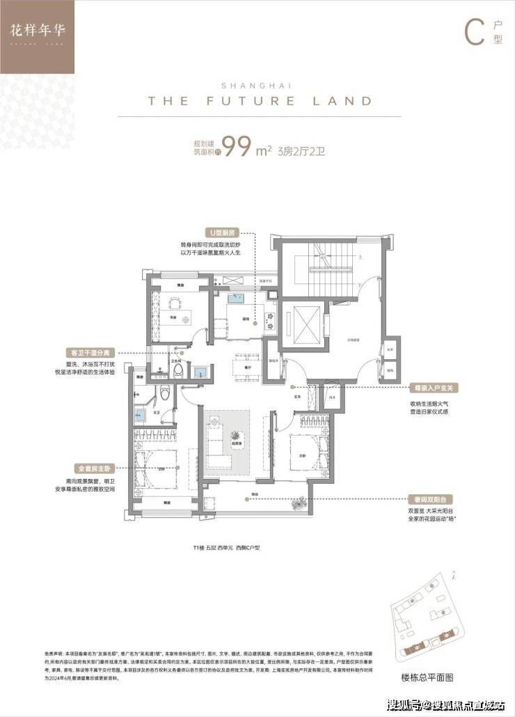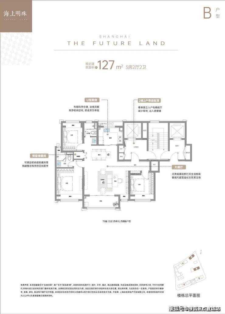 户型信息:主力户型为建面约 99㎡的 3 室 2 厅 2 卫、127㎡的 4 室 2 厅 2 卫和 145㎡的 4 室 2 厅 2 卫。户型设计上,多采用 2 梯 2 户配置,有独立入户电梯前厅,大横厅设计,采光和通风条件较好。