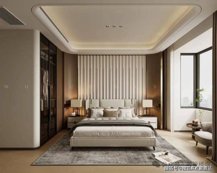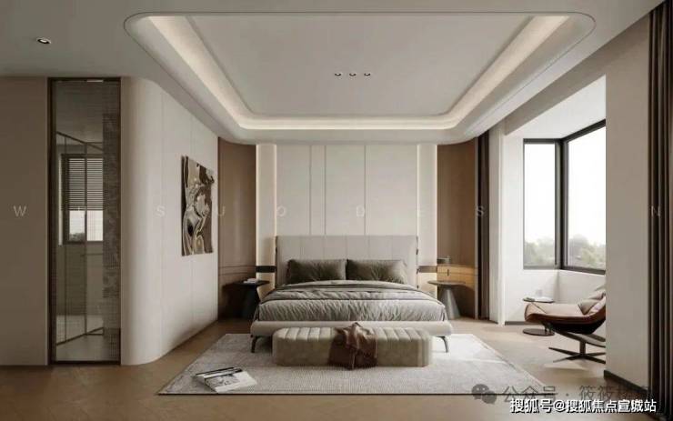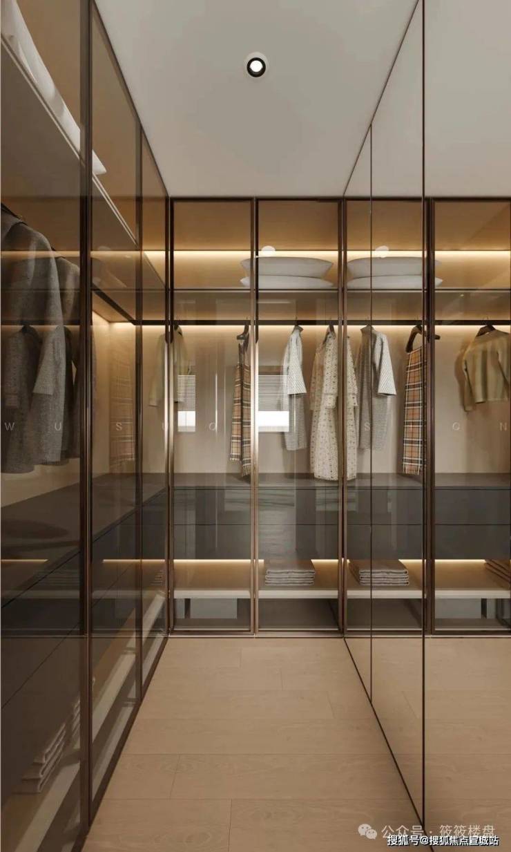 主卧套间采用酒店式情景设计:步入式衣帽间全部用茶色玻璃柜门,方便我们业主收纳和拿取;睡眠区背景墙以护墙板为主,与我们棉麻材质的床品形成对比,让整个空间形成张弛有度的放松感。