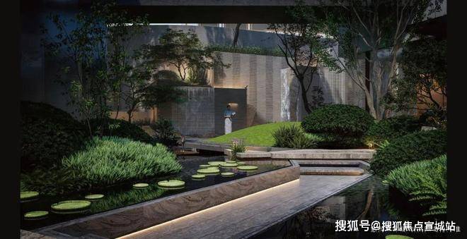 中央水韵庭院以【叠水莲池】为理念打造多层次的水景体系,叠水瀑布形成动态的水流韵律,池畔大理石打造的休憩长桌,晚上配合灯光,熠熠生辉。