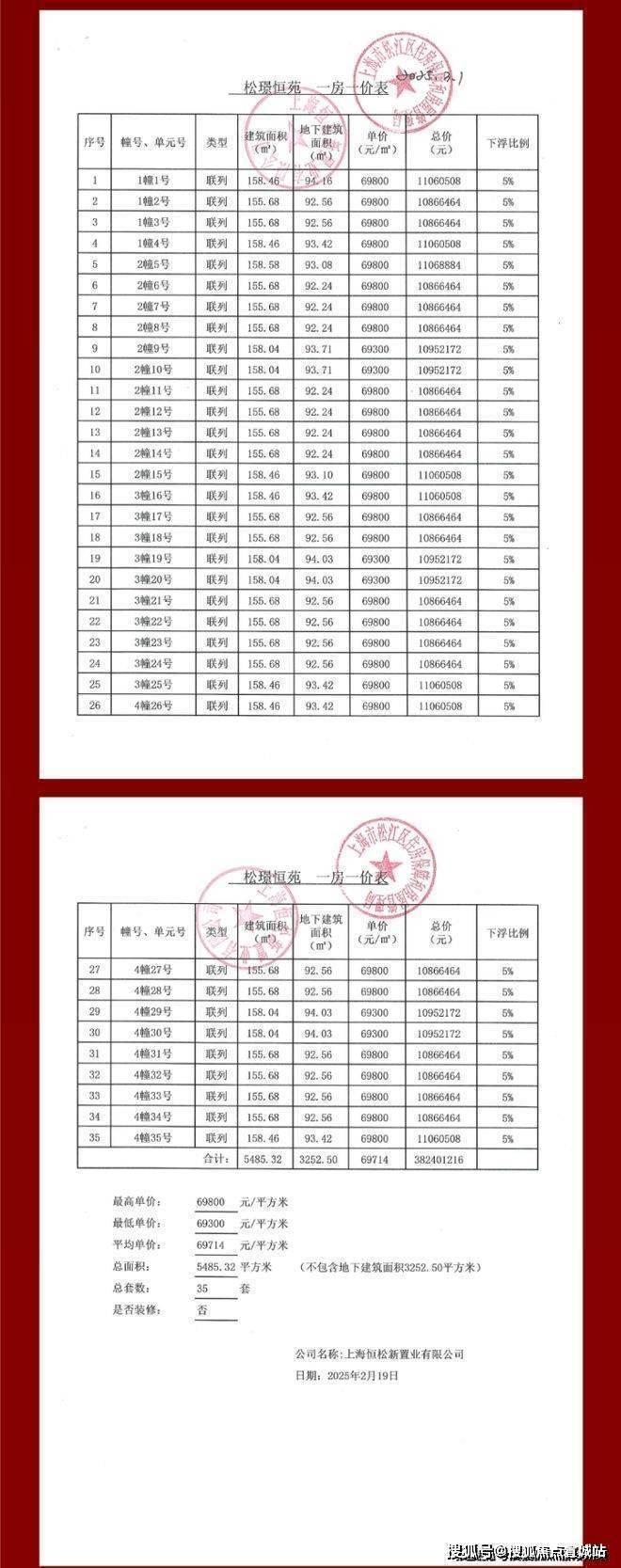 一房一价表如下