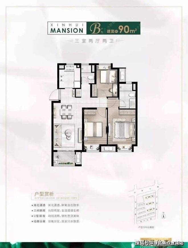 建面约94㎡3房2厅2卫户型特点:做到了三开间朝南+主卧套房设计+全卧飘窗+动静分离+卫生间干湿分离,功能性与空间感完美结合的3房“神户型”。