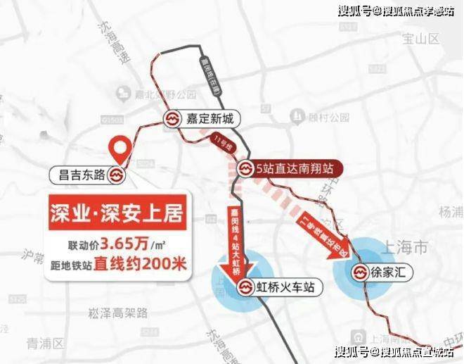 地铁11号线昌吉东路站直线仅约200米,2站可达嘉定新城,9站虹桥火车站,且同区域仅约1公里的深业安亭项目联动价已达4.2万/㎡。