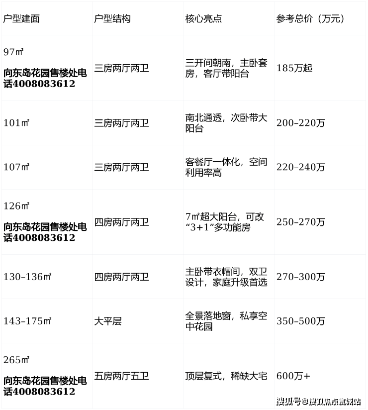 向东岛花园在售户型覆盖刚需至改善型家庭,主打 全明三房、四房及大平层 ,户型方正、动线合理,采光通风俱佳。