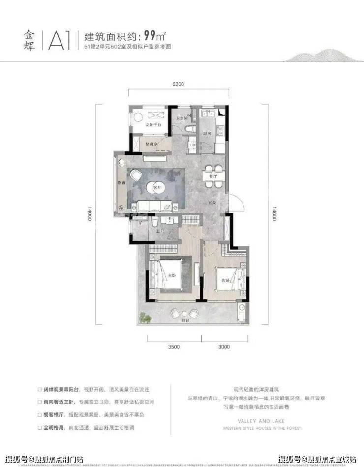 户型点评优势:双阳台设计,完美匹配湖山美景.客餐厨动线合理,观景飘窗连通了室内室外两重空间.南北通透、分区合理,尤其是储藏室的设计,十分贴心.99㎡的大两居,恰到好处地放大了各个功能区,整体看过去十分舒畅.