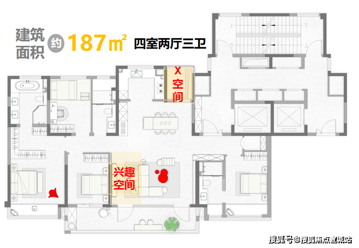 建面约187㎡4房3卫,也做到了约17.8米的惊人面宽。