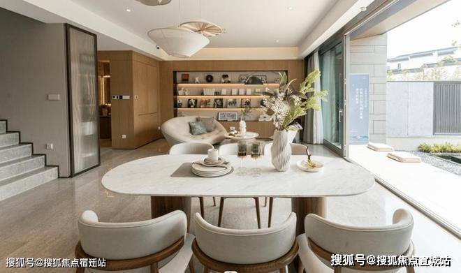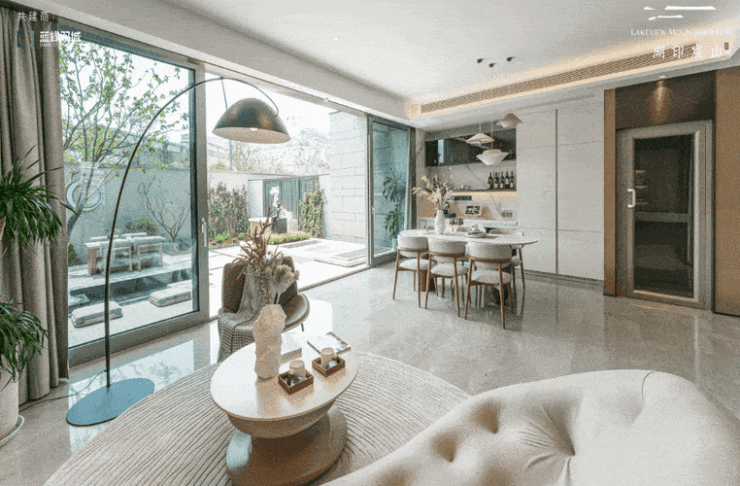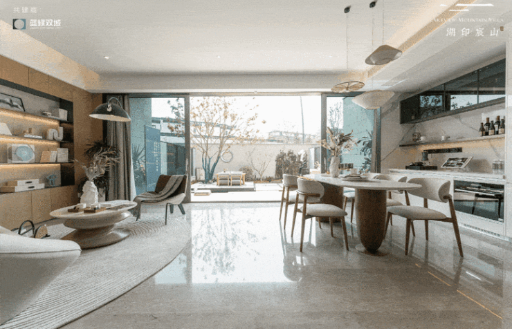 "每一栋别墅,都是对阳光的极致追求。双开间朝南设计,南向总面宽约7.5-8米,让温暖与光明成为家的常客。以约186㎡的边套为例,一楼的开敞式餐客大横厅,搭配270°环形景观视野,开间约8米,仿佛是大自然亲手绘制的画卷,每一寸空间都流淌着自然的韵律。