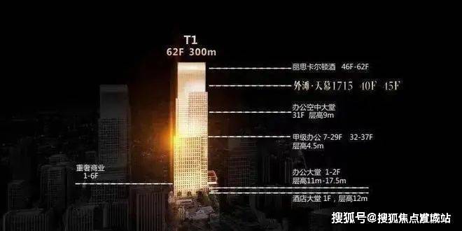 T1-300米超高层塔楼上部46-62层为五星级酒店(丽思卡尔顿)、外滩天幕1715售楼处电话:400-8851-337(预约热线☎)38,40-45层行政公馆,中部7-37层为甲级办公,底部为商业及大堂。