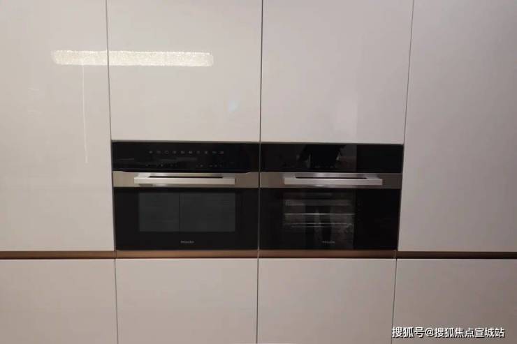 收纳体系是一大亮点。厨房拥有几乎两面墙的收纳空间,一边是灶台这里做了上下橱柜,另一侧是嵌入烤箱、蒸炉、冰箱等电器产品;