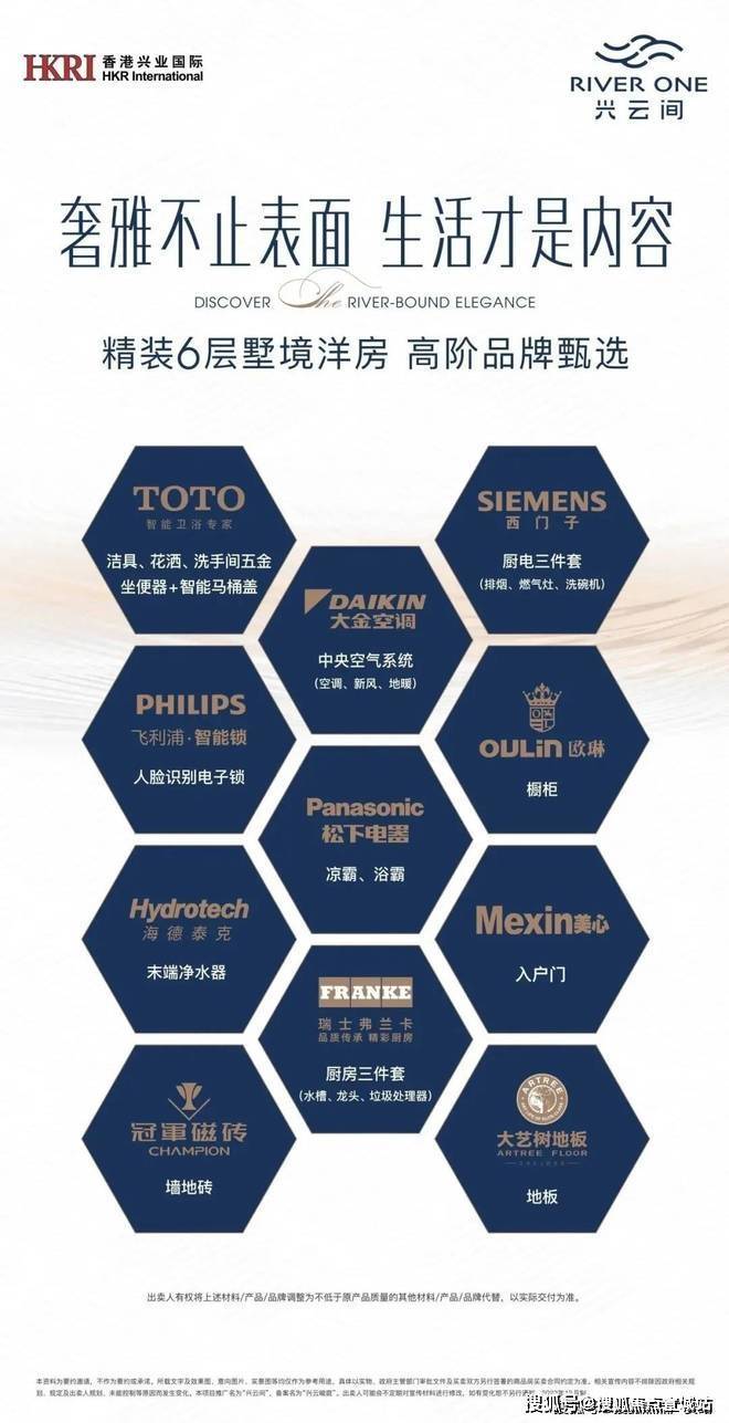 如大金的中央空气系统,包括空调、新风、地暖三大功能;西门子洗碗机、燃气灶、吸油烟机的厨电三件套;更有松下凉霸、弗兰卡台盆、龙头及垃圾处理器等等,入住即享品质生活。