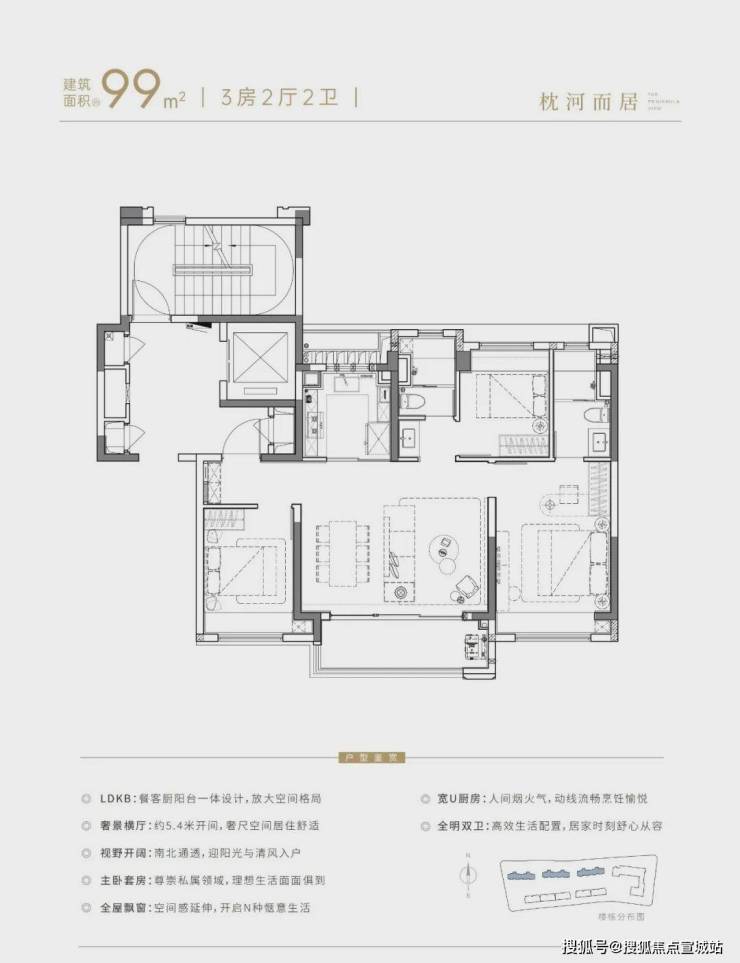 建面约99㎡滨水高层户型方正,功能性与尺度感兼得,在保证采光的同时,呈现开阔的空间场景。