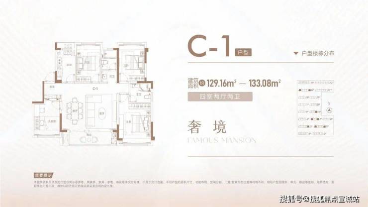 建面约108-129㎡:四房两厅两卫,四开间朝南,约7.2米宽厅,双套房设计。