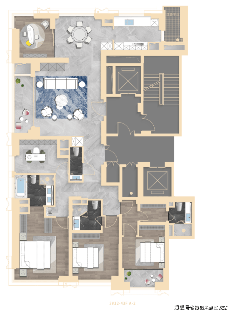 项目中心坐落的中央景观规模约3000㎡,周边环绕着四座建筑,其中三幢为超高层设计,整体布局高低兼顾,启承有序,开阖有度,塑造城市云端生活新方式。