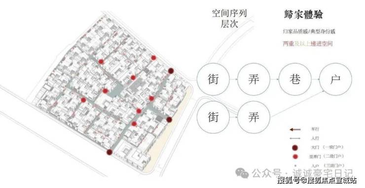 士林润园社区规划可分为蓬莱路城市公共景观以及社区内部景观两个部分,其中市政绿地衔接于上海2035城市总体规划中“蓝绿丝带”的上位条件要求,社区内部街巷空间形成空间序列形成递进的层次,将归家体验的序列依次展开,形成城市街道→入口(一级门户)→街巷→节点空间→里弄门(二级门户)→合院入户(三级门户)的方式,基本可保证大多数住户可体验到两重以上的空间递进。