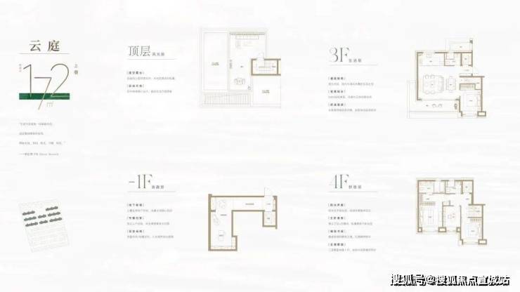 户型亮点:179㎡下叠样板,私梯入户,有花园、露台、地下室等超高附赠空间,首层设老人房,采用 LDK 大横厅设计,二层约 10 米超大开间,主人套房衔接全景露台。172㎡上叠样板,顶层有 L 型转角露台,270° 环幕观景台串联立体庭院,可揽翠大平层无界视野。