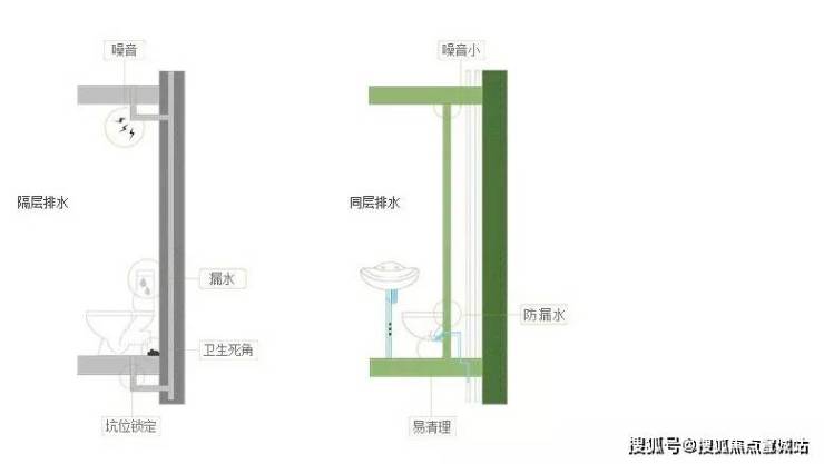这样的设计大大节约了室内空间、美化了视觉效果,同时消除卫生死角,防止异味。各种管道不穿越楼板,上下住户无干扰,做到静音排水,告别噪声。