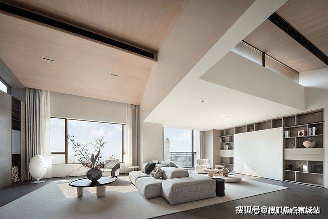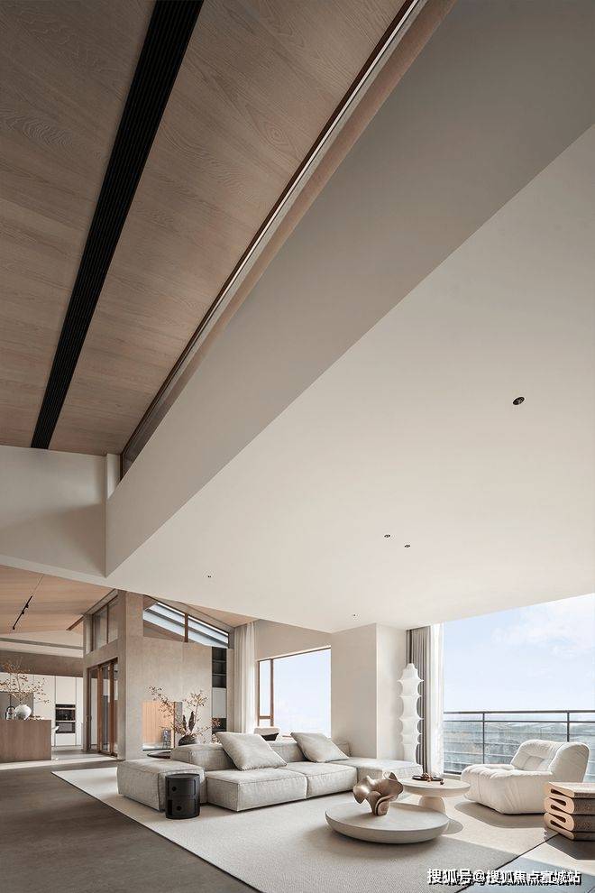 两面式沙发,打造出更随意的坐卧选择与舒适体验。木质吊顶铺展延伸,层次错落有致,仿若将室外的自然意境延伸到了屋内,简雅质朴而温润有加。
