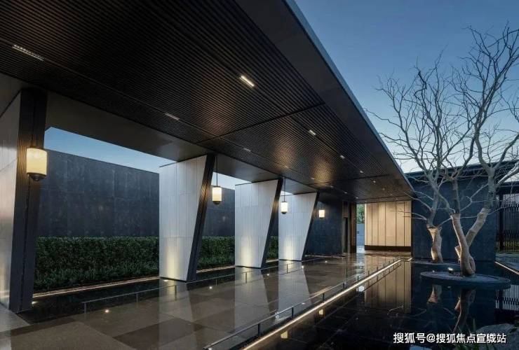 入口空间设计参考留园收放相间的造园手法,走进两侧略显狭长的廊道,穿过类似中式建筑的府门,迎宾庭院尽显眼前。尊崇归家礼序由此开启。