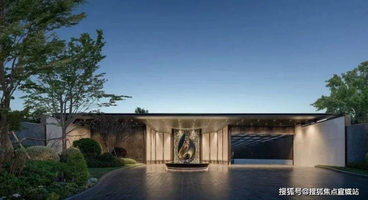 约38m奢感门庭,进深约20米的尊享落客区,承袭中式府邸的对称性布局。中央雕塑取意“苏州之心”整体呈现水滴造型,内部肌理犹如钻石切割。主入口景墙,甄选豪宅御用Prada绿奢石,弧面一体切割,仔细观察便可发现,整块石材纹理上下对称,龙头栩栩如生,犹如双龙出海,象征“鸿运当头”,归家第一步便是星级酒店般的仪式感。