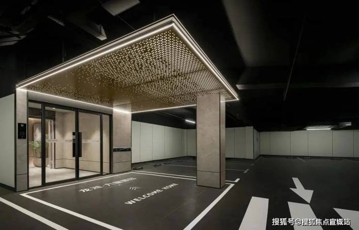 全域臻装车库,湖西限量版星空光厅,金属镂空铝板配合灯带打造了璀璨星空顶,搭配高质光感的行车地面,极具归家昭示性。约2.7m入户玻璃门凸显空间艺术感,增强空间通透性,艺术定制地面划线,划分区域,给予居者及行车安全保障。