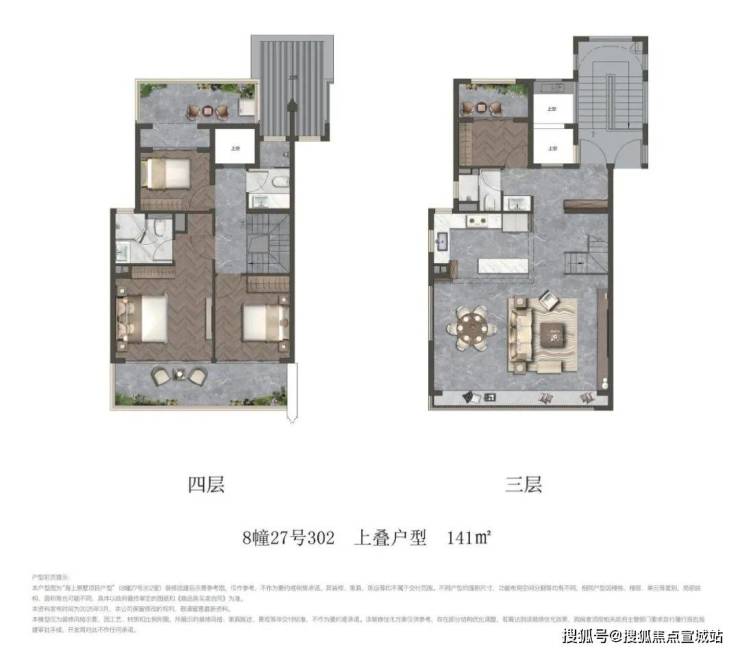 建面约141㎡上叠,餐客横厅设计,会朋宴客尽显风范;上层空间连通露台,可以瑜伽健身、莳花弄草,丰盈生活的厚度;多重卧室设计,功能性更强、更实用。