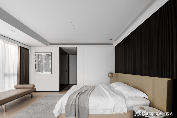 私密场域依旧保持静谧,黑白色基础上搭配了更多的色彩,例如深棕、浅紫等,艺术品的衬托深邃迷人,热络了家的氛围。大名城·映辰售楼处电话:400-8618-004