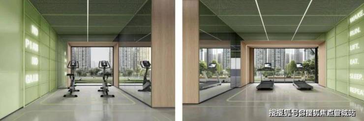 健身房-悦活天地:封闭管理,提供专业健身环境,空间内设跑步、拉伸、动感单车、休息、力量训练、水吧等功能区。
