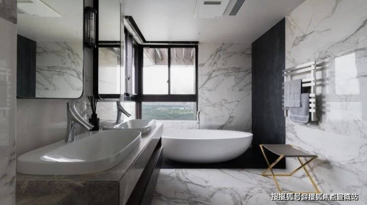 ▲墙面、地面处都是以白色砖的设计,靠窗布置一个大浴缸,结合双人位的台上盆洗手盆,也让卫浴空间显得更加干净简洁而时尚大方.