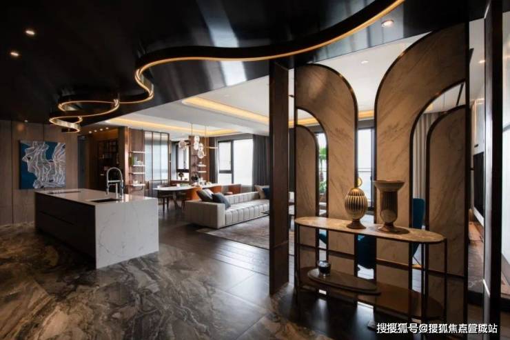 ▲玄关处加入一道金属+石材结合的屏风与端景台,布置陶艺品的装饰,让进门的第一视觉充满现代优雅的华丽感.天花上一道流线设计的造型,从玄关延伸到中岛台,也是显得更加有艺术气质.