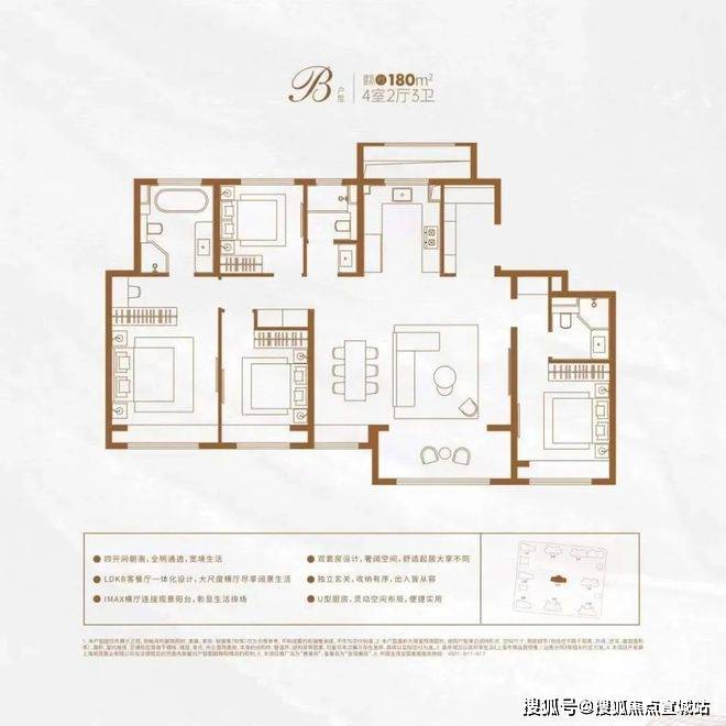 该户型集LDBK一体化、玄关入户、动静分区设计、U型厨房、双卧飘窗、强大收纳等多重优势于一体,在功能性与舒适度上几乎都做到了极致!