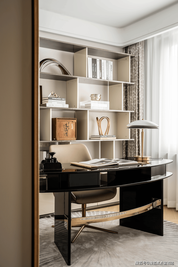 书房将专注工作的理想场所具像化,安稳,妥帖。深木色的主调和简约的家具,空间显得宁静而严肃。墙面的装饰画增加了一丝生气,使工作变得不再枯燥。