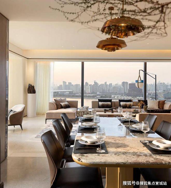 理石肌理与白色调交织相融,构筑起通透基底,焦糖色家具自带温和诗意,与窗外城市景致遥相呼应,共同勾勒出生活的丰盈画卷。