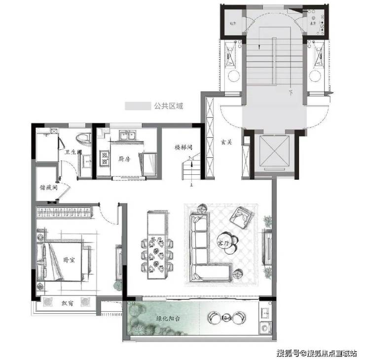 上叠一层入户玄关、独立储藏室完全贴心的空间设计,面宽约6.9米的餐客一体大横厅,跑道式双阳台、U型厨房,一家人其乐融融,这类户型非常满足三代同堂家庭的需求。