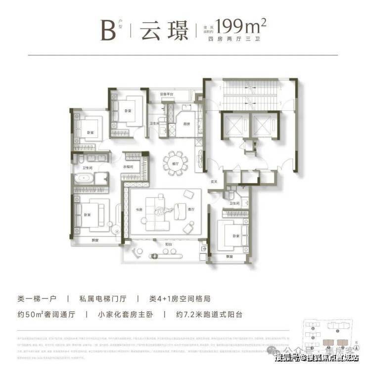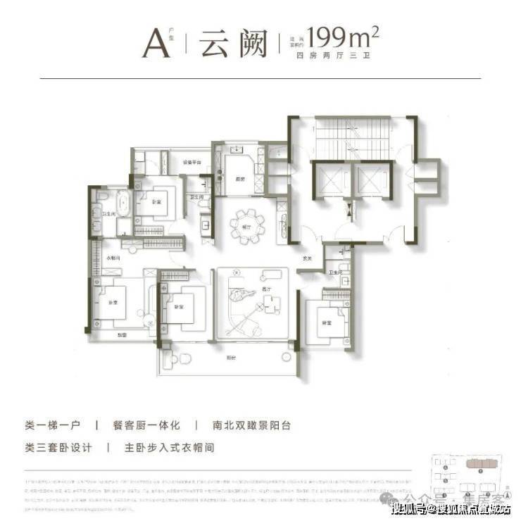 高层均为建面约199㎡的大平层户型,极致纯粹的业主圈层,带来更为尊贵的居住体验。其户型设计尽可能扩宽南向开间的同时,展现出了极为阔绰的空间尺度,足以满足多代同堂的居住需求,成为众多购房家庭终极改善的首选。