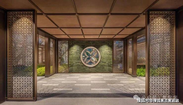 采用“王府中式”设计,大门为歇山顶形制(宽53米、高近11米),配黄铜狮、罗汉松及蓝翡翠奢石。园林融入西湖十景元素,如“花港观鱼”水景、“柳浪闻莺”绿植,并设雾森系统首层单元门厅石材铺就,肌理沉稳。