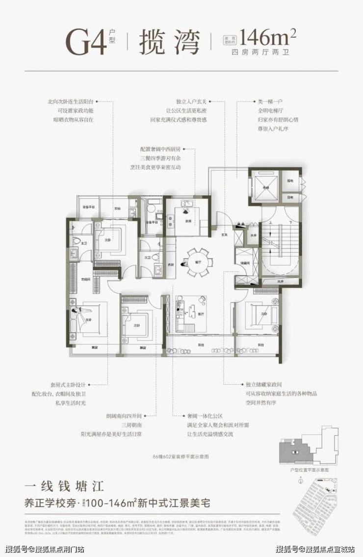 建面约146㎡户型分为“横板”和“竖版”,“横版”是四开间朝南+大方厅,“竖版”有大边厅+超长转角飘窗的“全景舱主卧”。