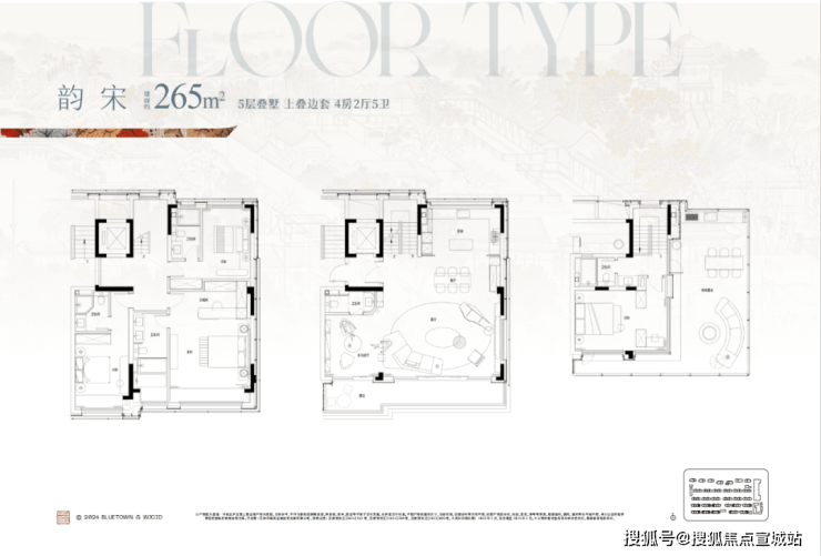 项目主力建面约168-280㎡的精装叠墅以及全精装修大平层,一层一厅、一叠双院、一叠双露台、全系套房、大品牌精装交付。