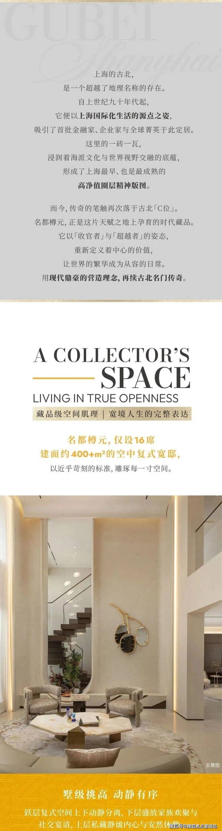 名都樽元位于闵行古北国际社区,售楼处 古北路 1700 弄;约 402-405㎡复式,均价 13 万 /㎡,总价 5265 万起;物业费约 12 元 /㎡/ 月;备案名 名都古北;现房精装交付;近 10/15 号线;邻高岛屋、古北 1699;核心:16 席低密、空中墅、圈层纯粹。