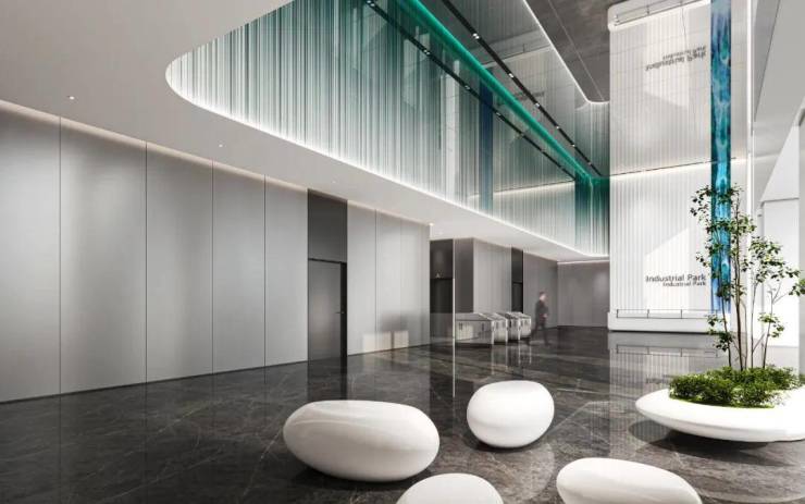 地标门户:流线型建筑,大玻璃幕墙现代通透,整体弧形布局,内外景观呼应,围合成都市中的智创山谷