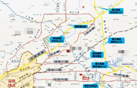 周边覆盖有厦深高铁惠州南站、深汕高速、惠深沿海高速、惠大高速可通达深圳、惠城、惠东等地。道路交通方面,北侧靠近大亚湾主干道中的龙海二路,西行直通坪山丹梓大道,北行转至新通车的东华大道快速通往惠阳淡水中心区,靠近规划中的14号线惠州站草洋站点。沿龙海二路东行转大亚湾大道可达大亚湾中心区及惠深沿海高速高速澳头入口。