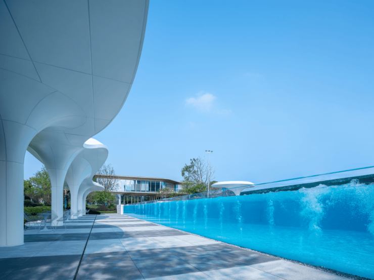 汲取新加坡“圣淘沙”泳池灵感,将建筑极简、纯粹的元素融入泳池设计之中,巨资打造约870㎡无边际叠水泳池,景观水面层层叠水,曲水律动与花园景致融为一体,玻璃围墙呈现无边际泳池般的通透感,营造出宁静自然的高端酒店式度假氛围。