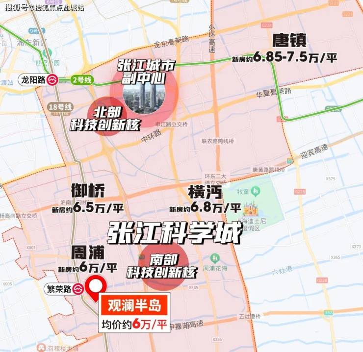 以张江为中心,科学城范围内各板块房价格局。红线范围内唐镇、橫沔、御桥百平米3房总价都在650-700万级。观澜半岛同样是总价600万级买到张江科学城红线范围内地铁房的天赐良机!